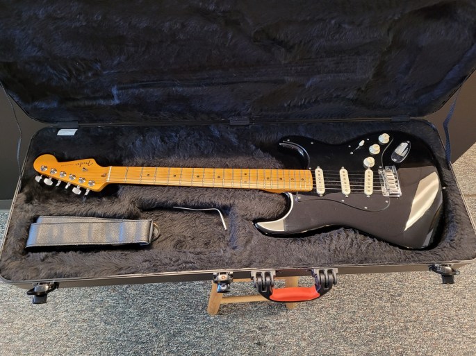 What a beauty! This gorgeous American-made Strat has the original pick guard, though the current owner switched it for a single-ply black. It has a great look, and an even better sound! Complete with an official Fender hard shell case and accessories.
